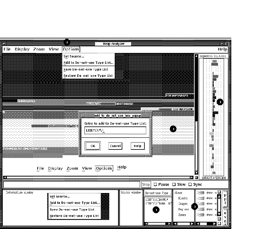 To add a segment type name to the Do-not-use Type List, you can select the Add to Do-not-use Type List pull-down menu item in the Options menu, or you can choose the Do Not Use Type pop-up menu item in the Memory Map, Type Histogram, or Views-and-Types Display. To delete a segment type from this list, choose the Use Type pop-up menu item in the Do-not-use Type List.