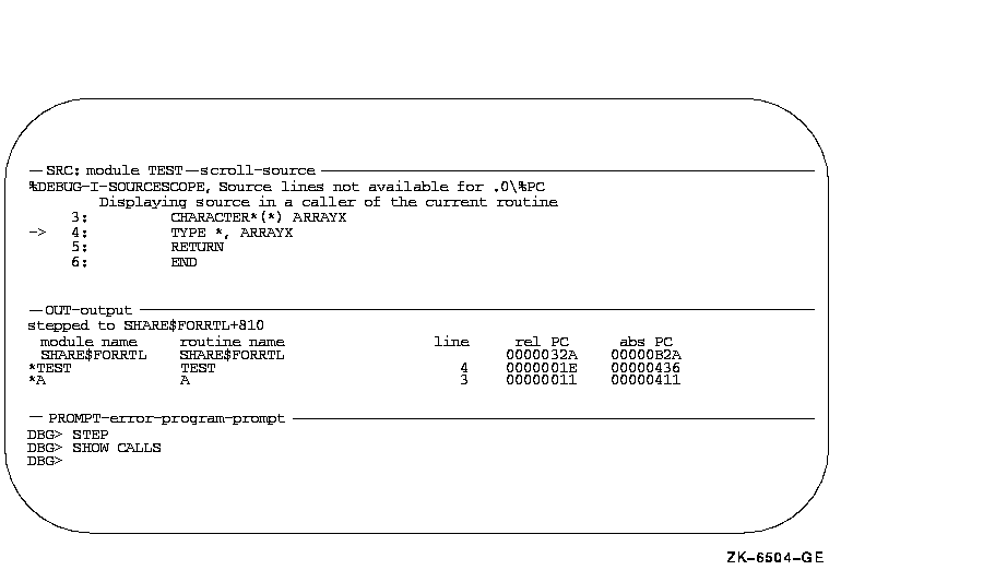 Figure 7-2 shows this feature. The source display shows that a call to routine TYPE is currently active. TYPE corresponds to a Fortran run-time library procedure. No source code is available for that routine, so the debugger displays the source code of the calling routine. The output of a SHOW CALLS command, shown in the output display, identifies the routine where execution is paused and the call sequence leading to that routine.