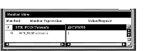 To monitor the value of the referenced object (to dereference the pointer variable), double click on the pointer name in the Monitor Expression column. This adds an entry for the referenced object in the monitor view, indented under the pointer entry (see the bottom entry in Figure 10-15). If a referenced object is an aggregate, you can double click on its name to display its elements, and so on.