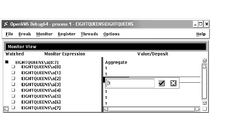 3. Click on the check mark (OK) in the dialog box. The debugger removes the dialog box and displays the new value, indicating that the register now contains that value. To dismiss the dialog box without changing the value in the register, click on X (Cancel).