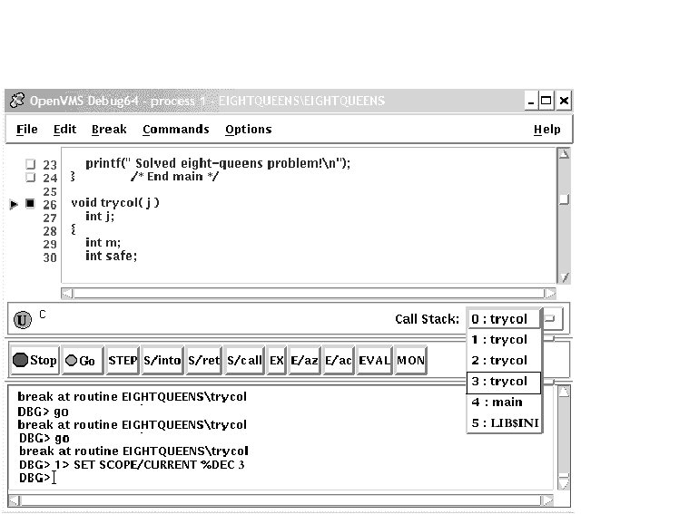 The Call Stack menu on the main window lists the names of the routines (and, under certain conditions, the images and modules) of your program that are currently active on the stack, up to the maximum number of lines that can be displayed on your screen (see Figure 10-19). The numbers on the left side of the menu indicate the level of each routine on the stack relative to level 0, which denotes the routine in which execution is paused.