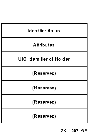 One identifier record appears in the rights database for each identifier. The identifier record associates the identifier name with its 32-bit binary value and specifies the attributes of the identifier. Figure 32-4 depicts the format of the identifier record.