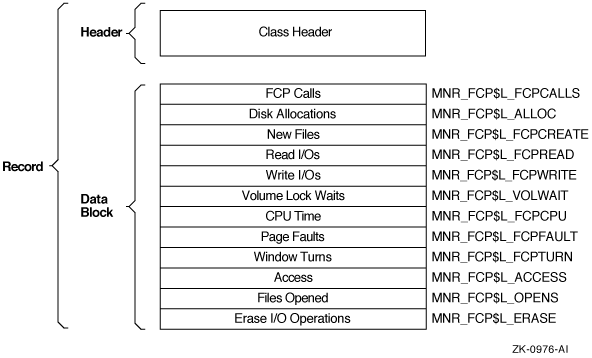 | Disk Allocations | MNR_FCP$L_ALLOC | Count of QIO requests that caused allocation of disk space (longword,C) |