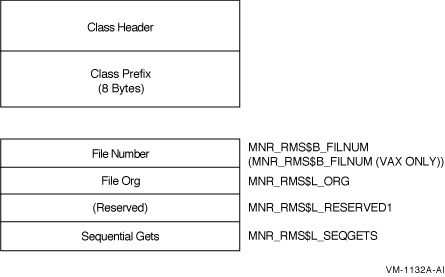 | Sequential GETs | MNR_RMS$L_SEQGETS | Count of sequential $GETs to the file (longword,C) |