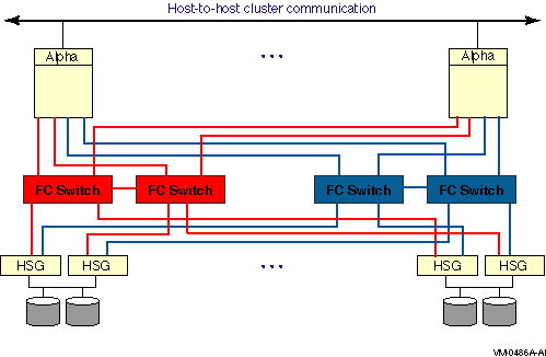 Figure 7-2 shows a physical view of a Fibre Channel switched topology. The configuration in Figure 7-2 is simplified for clarity. Typical configurations will have multiple Fibre Channel interconnects for high availability, as shown in Section 7.3.4.