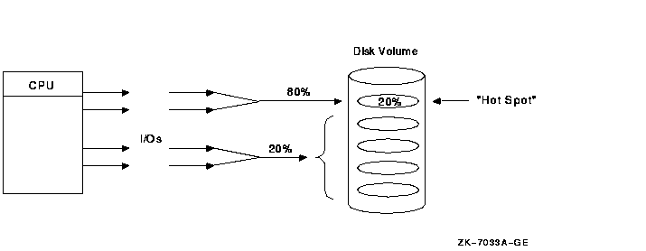 A "hot" file is a file in your system on which the most activity occurs. Hot files exist because, in many environments, approximately 80% of all I/O goes to 20% of data. This means that, of equal regions on a disk drive, 80% of the data being transferred goes to one place on a disk, as shown in Figure 10-25.