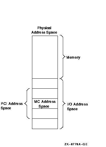 Figure B-8 shows the typical address space of a system, divided into physical memory and I/O address space. Within the PCI I/O address space, MEMORY CHANNEL consumes 128 to 512 MB of address space. Therefore, the MEMORY CHANNEL PCI adapter can be addressed within this space, and the CPU can write data to it.
