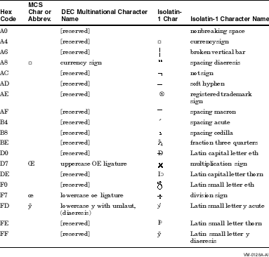 | Hex Code | MCS Char or Abbrev. | DEC Multinational Character Name |