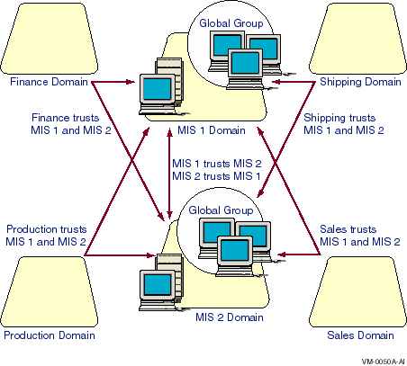 Every master domain trusts the other master domains. All domains in the company trust all master domains; therefore, every user account potentially can access every domain. The departmental domains, however, do not necessarily trust one another.