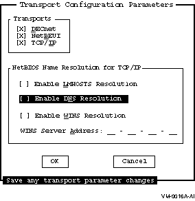 The Configuration Manager lets you enable or disable one or more of the following transports: DECnet, NetBEUI, TCP/IP. (Note that for wide area networking, the TCP/IP transport is required. DECnet also supports wide area networks but the functionality it provides is not as extensive as that provided by TCP/IP. NetBEUI is recommended only for use in small LAN-only environments (approximately 50 nodes or less).) For more information about transports and the protocols they support, see Appendix A, Network Protocols.