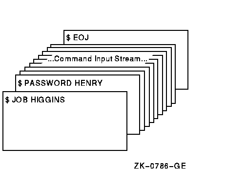 The JOB and PASSWORD commands mark the beginning of a batch job submitted through the card reader; the EOJ command marks the end of the job.