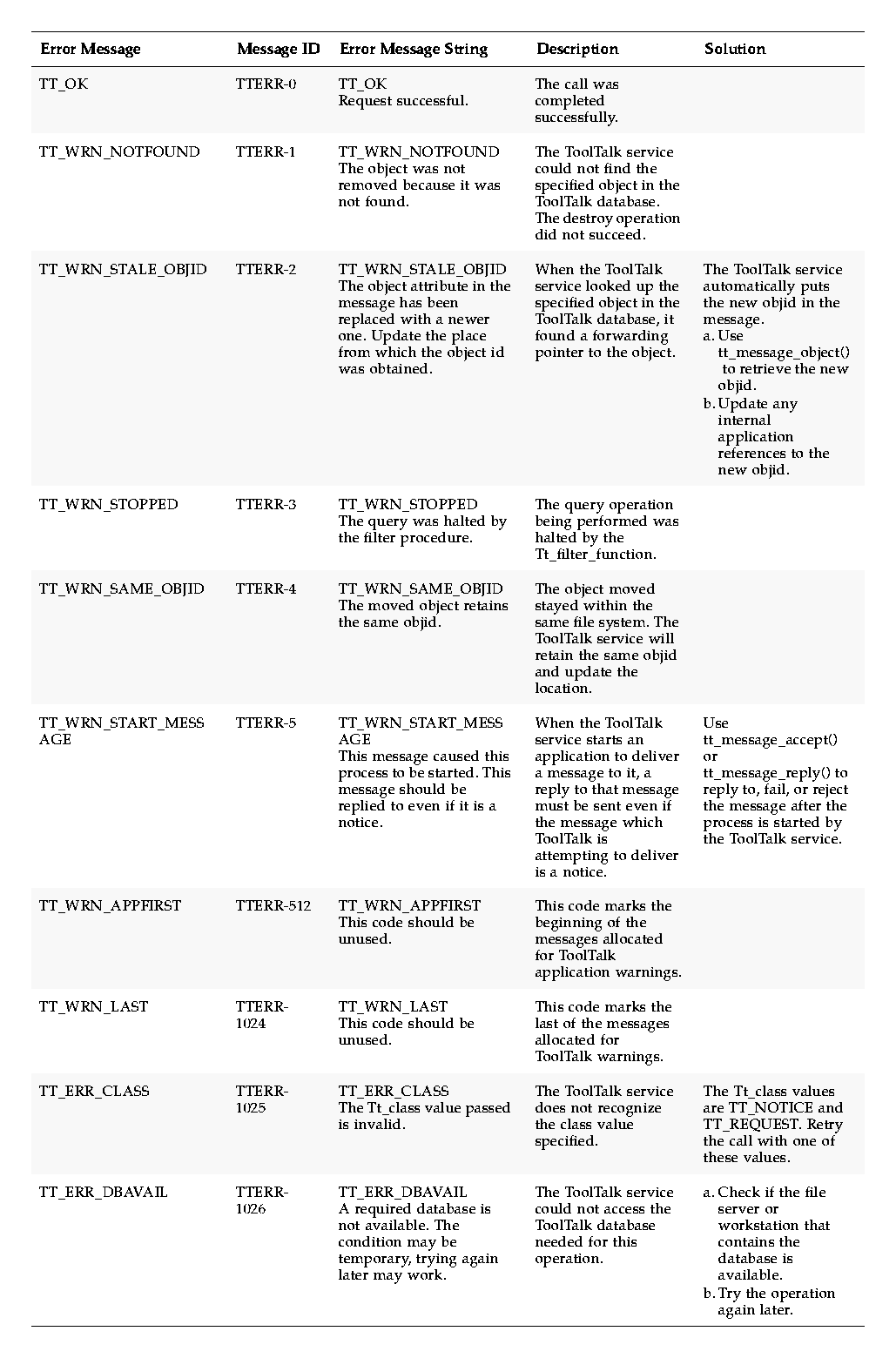 Table 7-1 Alphabetical List of ToolTalk Error Messages