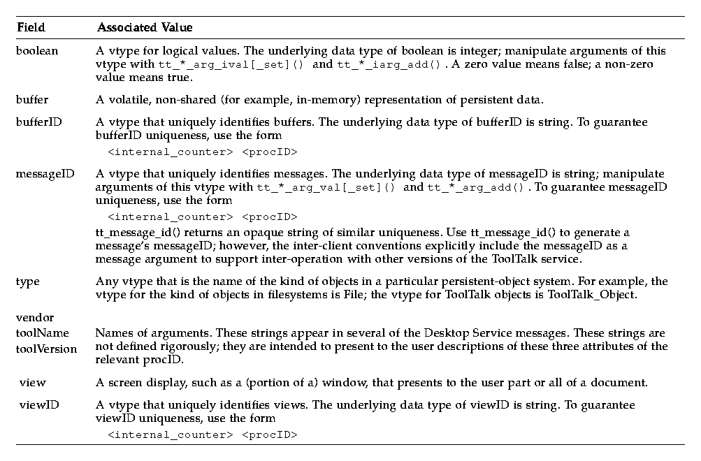 The vtype namespace for persistent objects currently only contains File and ToolTalk_Object. Vendors who want to define a type should either give it a vendor-specific name or register it through SunSoft's Developer Integration Format Registration program. SunSoft can be reached at