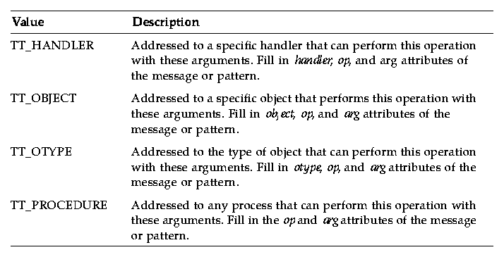 Tt_address indicates which message attributes form the address to which the message will be delivered. Table 2-1 describes the possible values.