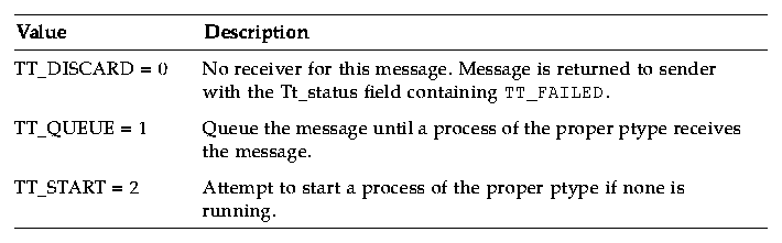 Note that Tt_disposition values can be added together, so that TT_QUEUE+TT_START means both to queue the message and to try to start a process. This can be useful if the start can fail (or be vetoed by the user), to ensure the message is processed as soon as an eligible process does start.