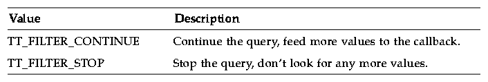Tt_filter_action is the return value from a query callback filter procedure. Table 2-6 describes the possible values.