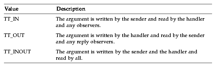 Tt_mode values specify whether the sender, handler, or observers writes a message argument. Table 2-7 describes the possible values.