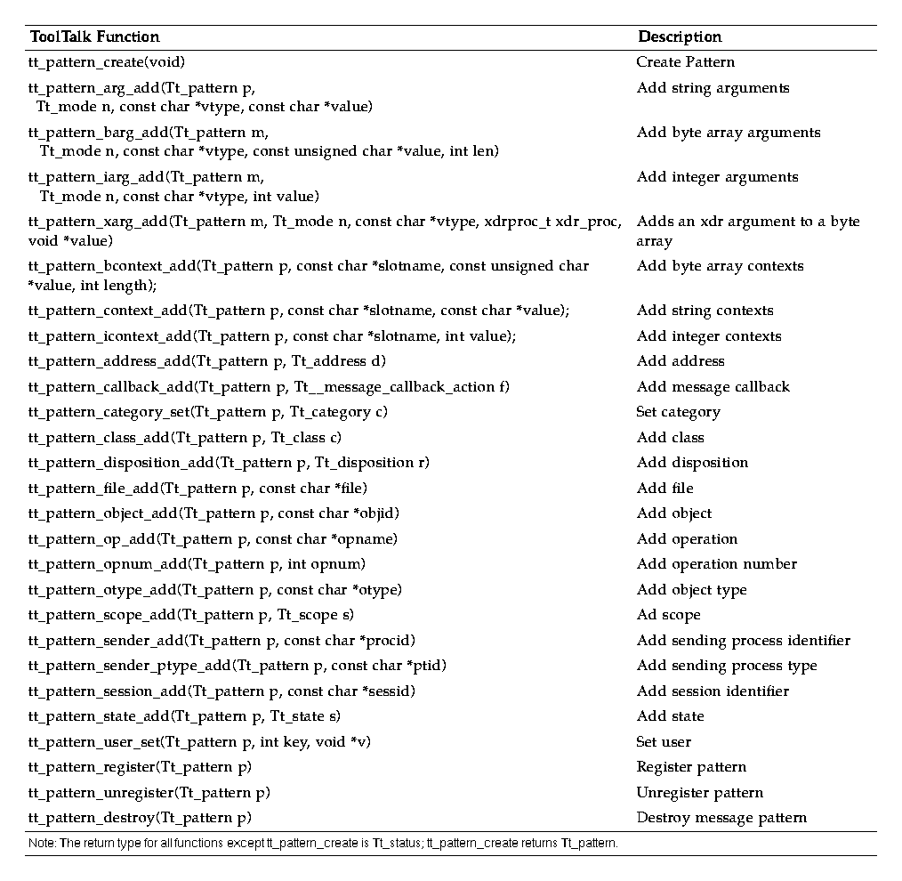 The ToolTalk functions used to create, register, and unregister dynamic message patterns are listed in Table 9-1.