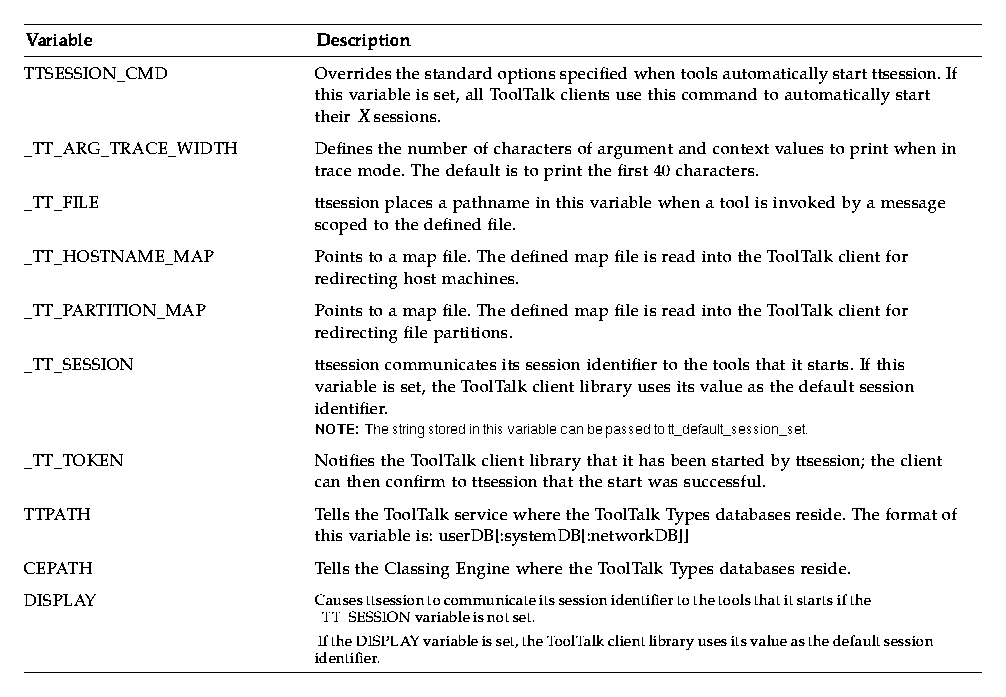 A process is given a modified environment when it is automatically started by the ToolTalk service. The modified environment includes the environment variables $_TT_SESSION, $_TT_TOKEN, and any contexts in the start-message whose keyword begins with the dollar sign symbol ($). Optionally, the environment variable $_TT_FILE may also be included in the modified environment if it is a file-scoped message.